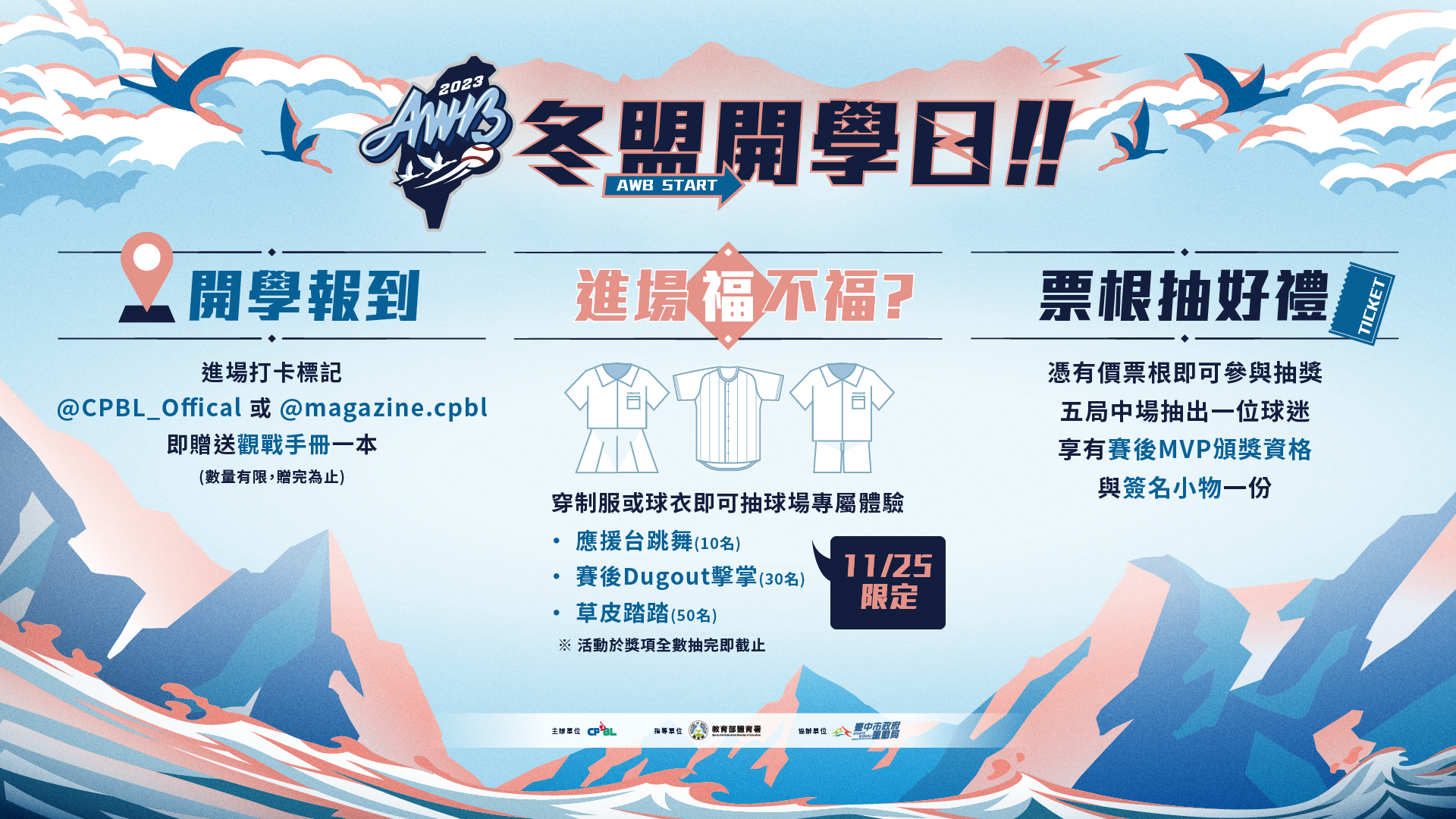 開幕週活動「冬盟開學日」打頭陣, 11月25日晚間在洲際棒球場「開學報到」,當天穿著球衣或制服進場,並在限時動態標記@CPBL_Offical或@magazine.cpbl,可獲得進場贈禮「2023亞洲冬季棒球聯盟」觀戰手冊,數量有限,送完為止。