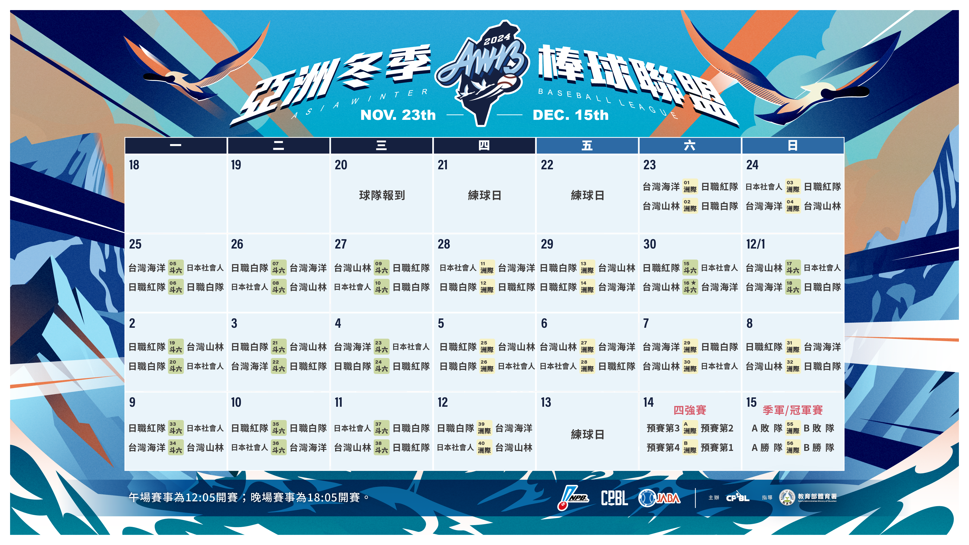 冬季聯盟賽事將從11月23日進行至12月15日,合計4週23天的比賽日程,每隊各出賽16場,加上四強賽、季軍賽、冠軍賽,總計44場賽事在台中洲際棒球場和雲林斗六棒球場進行,每日共2場比賽分別在中午12:05和晚上18:05在同場地開打。11月23日在台中洲際棒球場進行冬盟首日賽事,午間賽事由台灣海洋隊交手日職紅隊,晚間賽事則由台灣山林隊交戰日職白隊,賽前將舉行開幕儀式,正式宣告冬季聯盟開打囉!